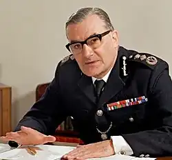 He was awarded the Queen's Police Medal in the 1965 Birthday Honours,[9] knighted in the 1973 New Year Honours,[10] and appointed Knight Grand Cross of the Order of the British Empire (GBE) in the 1977 New Year Honours.[11] He was appointed Knight of the Order of Saint John in 1978.[12]