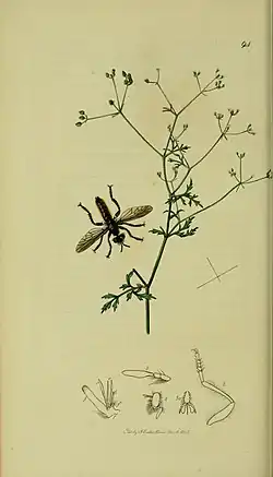 The species’ binomial name is Sison amomum,[4][5][8] [9][11][10][12][13] its common name is stone parsley.[4][5][8][9][12][13] The binomial name was used by Carl Linnaeus,[1][4][5][10] in his 1753 book Species Plantarum, which was the first to describe the plant species among many others.[1] The plant has also been referred to as bastard stone parsley, such as by John Curtis, in his book British Entomology published between 1824 and 1840. Another plant species, Cryptotaenia japonica is also known as stone parsley among many other names, it too is a member of the Apiaceae family with small white flowers, like Sison amomum, but it is native to East Asia.[14] Seseli, a different plant genus of around 140 species, also in the Apiacaea family, is sometimes referred to by the name stone parsley too.[8]