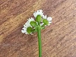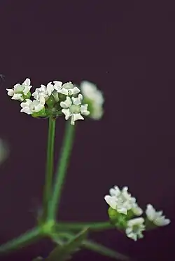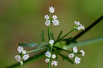 Stone parsley has tiny white flowers,[9][12][15][13] usually 1 to 2 mm (0.039 to 0.079 in) in size,[9][15] sometimes up 3 mm (0.12 in) in size,[12] with a green patch in the centre.[13] The flowers grow on long stalks of different lengths,[12][13] in umbels of between three and six smooth rays,[9][15] which can grow up to 3 cm (1.2 in),[15] or sometimes 4 cm (1.6 in)[12] wide. The flowers usually have five petals,[12] which are notched,[12][13] and irregular in shape,[13] five stamen, and two short styles,[12] but do not grow sepals.[12]