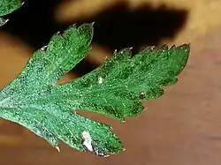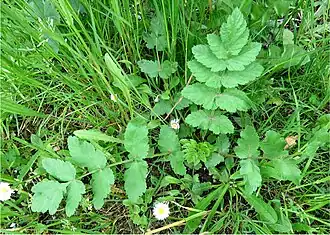 The plant has pinnate leaves arranged in five to nine pairs of rectangular toothed leaflets,[9][15] which are often lobed,[9][15][13] lanceolate toward the end,[15][13] and are hairless on widely branched stems.[13] The leaves nearer the bottom of the plant are usually larger than those near the top and can grow from 6 cm (2.4 in)[15] to 20 cm (7.9 in)[12] in length, and are imparipinnate.[12] When they wither the leaves can turn from green to purple before they fall off.[15] The smaller leaflets nearer the top of the plant are attached by short petiole,[15] and are oval to lanceolate and serrate, having teeth with forward curving points.[12] The species has short linear bracts,[9] usually between two and four[9][12] which emerge from below the umbels,[15] and up to four bracteole.[12]