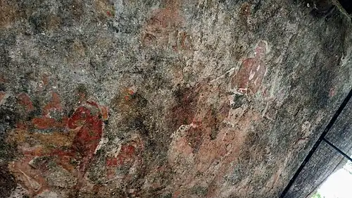 This Ravanachhaya rock-shelter consists of two large boulders stacked one above another, with the shape of a half-umbrella. The under-side of this naturally covered portion of the rock was cut, then smoothened and then inscribed and painted around the 4th-century CE. This smooth cut surface stands 22 feet above the ground and projects about 15 feet. The original painting spanned over 25 feet by 10 feet. There is a natural crack in the lower rock which likely emerged from natural causes and caused a portion of the original mural to be more exposed to the deleterious climate and damage. The other side of the mural remains preserved, though it was covered by tropical insect nests and cocoons at the time of re-discovery by archaeologists in mid 20th-century. The surviving portion of the mural is about 17 feet by 10 feet. The painter(s) chose to write the inscription first and then paint over it, which has helped date the mural.[1]
