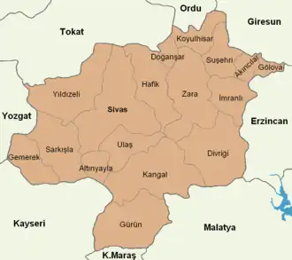 Sivas Province (Turkish: Sivas ili) is a province of Turkey. It is located in the eastern part of the Central Anatolia region of Turkey. Its area is 28,164 km2 (the second largest province after Konya),[2] and its population is 634,924 (2022).[1] Its adjacent provinces are Yozgat to the west, Kayseri to the southwest, Kahramanmaraş to the south, Malatya to the southeast, Erzincan to the east, Giresun to the northeast, and Ordu to the north. Its capital is Sivas.