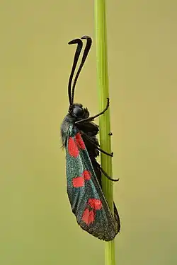 Zygaena filipendulae has a wingspan of 30–40 mm (1.2–1.6 in). The sexes are similar. The fore wings are dark metallic green with six vivid red spots (sometimes the spots are merged causing possible confusion with other species such as the five-spot burnet. Occasionally, the spots are yellow or even black. The hind wings are red with a blackish fringe. The larva is plump and hairy with variable markings, usually pale green with rows of black spots.[3]