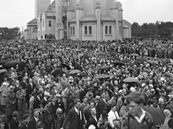 Despite rain and mist, 25,000 men, women, and children processed in the final procession in the afternoon.[15] Members of the 17th Infantry Regiment escorted the procession. The procession stopped for benediction at several locations, including Joseph Rummel's episcopal residence and Duchesne College. The final ceremonies were held at the cathedral.[12]