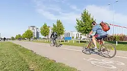 The bicycle path Center–Mežaparks was unveiled in 2007. It begins at the intersection of Skanstes and Hanzas streets, running along Skanstes and then Gaujas street, crossing the railroad by Brasa station and then along Ķīšezers street and Koknese prospekts, leading to Meža prospekts. The total length of the path is 6.6 kilometres (4.1 mi) and allows one to reach Mežaparks from the center in 25 minutes. The bicycle path now has a 5-kilometre-long (3.1 mi) extension from Mežaparks to Vecmīlgrāvis. A further extension to Vecāķi is planned.