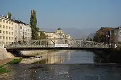 Somewhere near the bridge's current location, the Ottoman governor, Skender Pasha, had a wooden bridge erected at the end of the 15th or beginning of the 16th century. The neighborhood of Skenderija on the left bank of the Miljacka is named after him.[1]