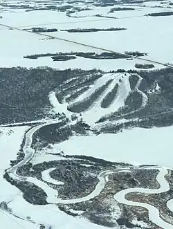 Ski Valley is a ski resort in Manitoba about seven kilometers (4.3 mi) north of Minnedosa, Manitoba. The slopes are on the valley of the Little Saskatchewan River. There are nine runs with a vertical drop of 80 meters. The hill is covered with snow making equipment ensuring about three months skiing every winter. The chalet and runs were built in 1975.[1] Skiers get to the top on the double chair lift[2] and beginners use the rope tow to ski on the bunny hill. Ski equipment and boards are available for rental as well as trained instructors.[3]