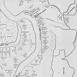 After the war the Freedmen's Bureau sent an agent to the landing to encourage freedmen to maintain a new attitude of freedom, take testimony in their jurisdiction and demand labor contracts be drawn up for their protection.[14] There was a U.S. post office at Skipwith's in 1870.[15] Some reported that Skipwith Landing's major municipal advantage was that it had a store that sold liquor.[16] For a time there was a cut made by the river that was known as Skipwith's Chute.[17] Skipwith Crevasse was a spot where the river had pushed through and was likely to cut a new course if not blockaded.[12]