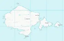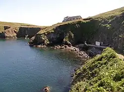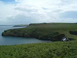 The island is almost cut in two near its eastern side by two bays.[5][6] It is one of several islands lying within 1000 yards (a kilometre) of the Pembrokeshire coast. A number of islets surround Skomer, the largest of which are: Midland Isle (height 50 metres (160 ft)) separated from Skomer by Little Sound, Mew Stone (height 60 metres (200 ft)) and Garland Stone (height 32 metres (105 ft)).[7]