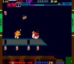 In Sky Skipper, the player pilots a biplane through scrolling mazes to save animals caged by enemy gorillas. The player must drop bombs onto the gorillas which will temporarily knock them out and unlock the cages. Then, the player must swoop down to pick up the animals before the gorillas get up and lock the cages again. Flying into a gorilla or wall destroys the plane, resulting in the loss of one life. The plane's fuel gauge goes down while flying, and is replenished by picking up the animals. There are four stages in total, which are repeated on increased difficulty.[5]