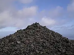 On the summit are the remains of two prehistoric burial cairns. The Great Cairn is at the highest point and measures about 1 m (3 ft 3 in) high, 36.5 m (119 ft 9 in) from north to south and 43 m (141 ft) from east to west. It appears to have been a Neolithic passage tomb, dating to 3300–3000 BC. It is the highest known passage tomb in Britain and Ireland.[11] The Lesser Cairn lies 210 metres to the northeast, overlooking Newcastle. It measures about 4.5 m (14 ft 9 in) high, 18 m (59 ft) from north to south, and 16 m (52 ft) from east to west. It appears to have been an Early Bronze Age multiple-cist cairn, dating to 2300–1950 BC.[11] In the past, the cairns had a much more well-defined shape and it is thought the Great Cairn had an east-facing entrance leading to an inner chamber.[12] They appear to parallel the two cairns on Slieve Gullion, which can be seen from Slieve Donard.[13]