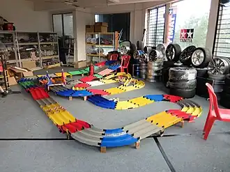 One type of 1:24 commercial track is the "Blue King" (155-foot lap length) which is the track that is recognized for world records in 1:24 racing[3] The 2017 world record qualifying lap is held by Brad Friesner at 1.347 seconds, which computes to 78.45 mph. The "King" track segments are "named" starting from the main straight in an anti-clock wise direction: bank, chute, deadman (corner), finger, back straight, 90 (corner), donut (corner), lead-on, and top-turn. Generally the "King" tracks are used for wing-car racing, where un-banked "flat" tracks of various designs are used for scale racing. An example of a championship "flat" track is the Gary Gerding designed track installed in July 2007 at Mid-America Raceway and Hobbies[4] near Aurora, IL (the site of the 2009 USRA Division 2 National Championships)and the 2010 ISRA world championships.