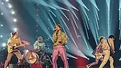 In order to promote "Carpe Diem" as the Slovenian entry for the 2023 contest, Joker Out embarked on a promotional tour across Europe and Slovenia. They became the first Slovenian Eurovision entrants in history to attend all promotional parties.[30] The band were the first to be confirmed as attending the Barcelona Eurovision Party on 8 April 2023.[31] The band also appeared at pre-parties in Madrid, Tel Aviv, London, Warsaw and Amsterdam.[27][32] On 9 March, the band revealed that they were recording an English-language version of "Carpe Diem", after approaching fans on Instagram, with the track later released on 31 March 2023.[33][34] On 29 April 2023, the band travelled to Liverpool in order to film a music video to their new single "New Wave" in collaboration with English singer Elvis Costello.[35] They appeared on several British radio stations including BBC Radio Merseyside.[36] On 9 April 2023, "Carpe Diem" was played at Anfield before a Premier League football match between Liverpool and Arsenal.[36][37][38] On 20 April 2023, RTVSLO held a press conference in Ljubljana, with Slovenian media having the opportunity to talk with Joker Out. The band also detailed their preparations for the contest and the concept of their staging plans with the BBC. The band also made several virtual appearances with media outlets in Croatia, Slovakia and Austria. On 25 April 2023, the band held a special concert in Prešeren Square, Ljubljana, where they performed a catalogue of songs including "Carpe Diem" in their final performance in Slovenia before departing for Liverpool.[39][40][41] On 30 April 2023, the band also released a party version of the song, which was premiered on the Eurovision YouTube channel.[42]