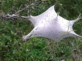- ^ Ruf, Claudia; Fiedler, Konrad (December 2002). "Tent-based thermoregulation in social caterpillars of Eriogaster lanestris (Lepidoptera: Lasiocampidae): behavioral mechanisms and physical features of the tent". Journal of Thermal Biology. 27 (6): 493–501. Bibcode:2002JTBio..27..493R. doi:10.1016/S0306-4565(02)00022-0.