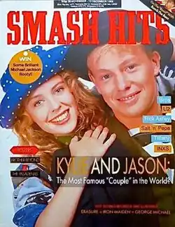 ![]() Cover of a 1988 edition of Smash Hits featuring Australian pop singers Kylie Minogue and Jason Donovan. | |