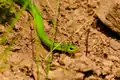 O. vernalis can be found in many different habitats, including marshes, meadows, the edges of streams, and open woods. It prefers to be on the ground, in open areas without a lot of shrubs. During hibernation, the smooth green snake looks for burrows, ant hills, and other dug-out underground areas, normally gathering in large numbers.[3] It prefers moist habitats and areas near permanent water sources, usually staying in green areas for camouflage.[9][19] Being cold blooded, it prefers warm areas, lying in the sun on rocks and logs, also using them for hiding.[12]