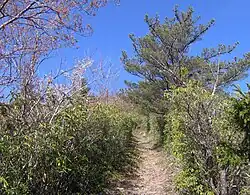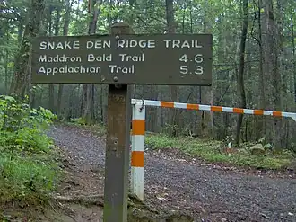 At around 4 miles (6.4 km), vestiges of the coniferous forest that blankets the higher elevations in the Smokies begin to appear. The trail passes through a final switchback to the poorly lit western flank of Snake Den Ridge and ascends southward along a steep, rock-strewn incline to its junction with the Maddron Bald Trail. Maddron's heath-covered summit is located along the Maddron Bald Trail approximately 0.5 miles (0.80 km) west of the Snake Den Ridge Trail junction.