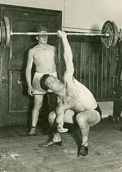 Split snatch was the common form of snatch before squat snatch was popularized by lifters such as Pete George and Dave Sheppard.[3][4] In the split snatch, the lifter lifts the bar as high as possible and pulls themselves under the bar similar to the squat snatch but in the split snatch the lifter "splits" their legs, placing one foot in front of them and one behind, allowing themselves to receive the bar in a low position. The split snatch is now uncommon but is still occasionally performed by some lifters. Most lifters prefer the squat style over the split because the bar needed to be pulled higher and longer in the split style, and they can go lower in the squat.[3]