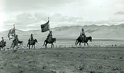 In addition to being carried by Tibet's army, the flag was displayed on public buildings of the Ganden Phodrang government. Historical footage shows the flag flying at the foot of Potala Palace, the seat of the Dalai Lama in Tibet.[11] The snow lion motif was also used on a flag seen by English diplomat, Sir Eric Teichman, flying above a Tibetan government building during hostilities between Sichuan and Tibet in 1917–1918: "Over the Kalon Lama’s residence ... floats the banner of Tibet, a yellow flag bearing a device like a lion in green, with a white snow mountain and a sun and moon in the corner."[12]