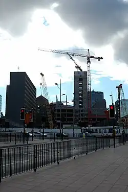 On 13 May 2002, Birmingham City Council adopted the Snow Hill Development Brief for proposals on the site as Supplementary Planning Guidance to the Birmingham Unitary Development Plan.[4][16] The brief set out planning and urban design guidance for developers interested in developing the site. It also provided a framework for the future development of the wider area around St Chad's Circus. In May 2002, the brief was adopted as Supplementary Planning Guidance to the Birmingham Plan for use in determining planning applications for the site.[17] The development brief outlined a strategy which incorporated the extension of the West Midlands Metro light rail line and the conversion of Snow Hill Queensway to an 'urban boulevard'. In converting Snow Hill Queensway into an urban boulevard, St Chad's Circus would be levelled to enhance the surroundings of St Chad's Cathedral.[4] The development brief also stated that the development must consist of a series of buildings as opposed to one monolithic building. The tallest of these buildings should be 12 storeys and step down, avoiding the use of false ground levels.[4] An artist's impression of a potential design was produced for the development brief.[18]