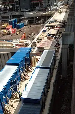 Phase 1 consists of the construction of a tram viaduct alongside Livery Street car park to take the West Midlands Metro into the city centre. The viaduct will commence at Great Charles Street Queensway, adjacent to the bridge carrying railway services into Snow Hill station, and run along the length of the Snowhill site. It will end at a piazza deck, from which the West Midlands Metro will leave the Snowhill site and go onto Colmore Circus, if the extension of Line 1 is approved. The bridge that will carry the West Midlands Metro over Great Charles Street Queensway will be designed by a separate practice and be part of a separate planning application.[31] The viaduct will be covered in 50 mm (2 in) pebble ballast.[32] There will be 16 sets of reinforced concrete columns supporting the viaduct which consists of reinforced concrete beams and a reinforced concrete parapet. Beneath these will be a service road for deliveries to the retail units and the hotel.[33] For the construction of the viaduct, Tarmac Precast were awarded a £300,000 contract by Kier Build to manufacture 250 specially designed TY and TYE complementary edge beams. The beams were manufactured over a six-week period Tarmac Precast's Henlade site.[34] The service road will be tarmac, lined with precast concrete kerbs, separating the road from the concrete pavement for pedestrians.[35] The concrete deck that will carry the West Midlands Metro will be 650 mm (26 in) thick.[31] In total, the viaduct will be 220 m (722 ft) long and is being built by the Kier Group.[36] The viaduct was designed by Alan Baxter and Associates LLP consulting engineers with Sidell Gibson Architects,[31] and is estimated to cost £9 million.[37]
