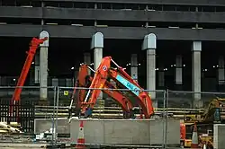 For the work at basement level at Phase 4, Bachy Soletanche used two 50-tonne (49-long-ton) support cranes and two Bauer BG 22 piling rigs.[77] Construction of Phase 3 is being assisted by three tower cranes. The first crane to be assembled, TC3, is to be the shortest of the three tower cranes. It has a maximum height of 45 m (148 ft) and has a luffing jib. It was built in one stage. It is a free standing crane and will allow podium level construction. Once construction at podium level is completed, it will be dismantled and replaced by two number gantry joists.[86]