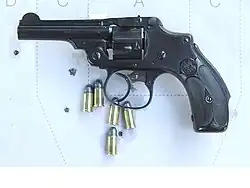 The Smith & Wesson Safety Hammerless model was produced from 1887 to World War II. It is a small, concealable, 5-shot, double-action revolver chambered in either .32 S&W or .38 S&W. They were most often produced with 2 in (51 mm), 3 in (76 mm) and 3.5 in (89 mm) barrels.[10][11] These top-break revolvers were designed for fast reloading and concealed carry as the hammer was internal and would not snag on drawing the revolver from a pocket. The gun also had a grip safety. This design was known as "The New Departure" to reflect the company's new approach to designing revolvers.[10] The design of these revolvers sacrifices accuracy and range in favor of maneuverability and concealment. Similar "hammerless" designs were made by manufacturers such as Iver Johnson and Harrington & Richardson and proved popular for concealed carry.