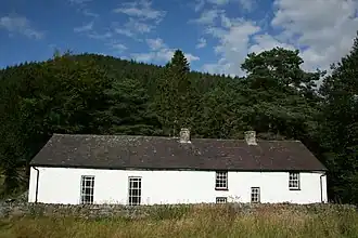 Soar-y-mynydd is a simple Cadw grade II*-listed building made of local rubble stone collected from riverbeds and ruined farmsteads in the area.[5] It is whitewashed on the outside. It consists of a traditional rectangular side-wall façade chapel at the northern end, attached to a small two-storey house with two chimney-stacks on the ridge, under a single slate roof; the house is now derelict. The chapel is entered on the longer east side through two pairs of doors, and the pulpit is located between the two doorways. A prominent feature is the painted scroll above the pulpit with the text "Duw cariad yw", i.e. 'God is love' (First Epistle of John 4:8 and 4:16), dating from 1911. The local school met in the chapel-house until the 1940s. The chapel enclosure is walled in stone and skirted by mature trees. On the east side of the building is a graveyard, the oldest apparent stone being from 1856. The most conspicuous is the most recent (2001), that of Professor John Griffiths, a prominent London cancer surgeon.