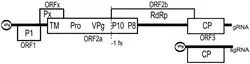ORFs 2a and 2b encode the replicational polyproteins P2a and P2ab. Translation of ORF2a from the genomic RNA is dependent on a leaky scanning mechanism.