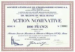 In 1983, ASUAG and SSIH were forced by the Swiss Banks to merge into Société de Microélectronique et d'Horlogerie (SMH), which now has been renamed Swatch Group.[2] ASUAG grouped most of the movement parts & Ebauches manufacturers on one side, and through its sub-holding General Watch Co (GWC); many watch brands on the other side. Most of those companies are still active, integrated into the new conglomerate.