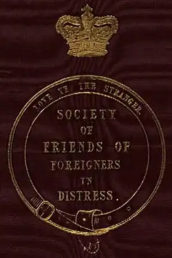 The Society of Friends of Foreigners In Distress is a charitable organization in London England whose aim is to "... grant relief to indigent foreigners here, without distinction of country or religion; especially to those who are not entitled to parochial aid: and to furnish the means to such as are desirous to return to their own countries."[1]