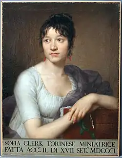 Early in life, she evinced a talent for drawing, and the painter Pietro Jacopo Palmieri (1737-1804) recommended further study, in which she was supported by banker Giacinto Vinay. At 18, she went to Rome to study miniature painting and pastel with Therese Maron.[2] During this time, she became a member of the Accademia Nazionale di San Luca, upon which occasion her portrait, still held by the Accademia, was painted by Giovanni Domenico Cherubini (1754-1815).[3] She produced three pastel copies during this period of her study before turning to painting miniatures on ivory.
