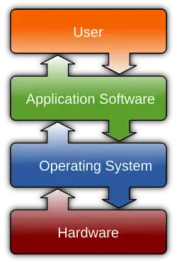 A diagram showing how the user interacts with application software on a typical desktop computer. The application software layer interfaces with the operating system, which in turn communicates with the hardware. The arrows indicate information flow.