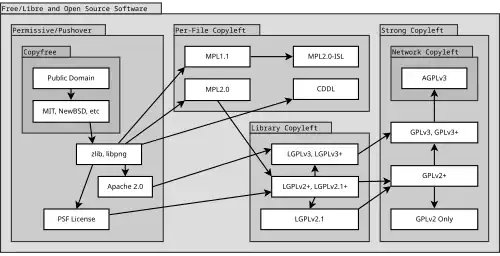 | Notable software licenses | PD, CC0[8] | MIT, Apache, MPL, BSD | GPL, AGPL | JRL[9] | Proprietary software | SSPL | |