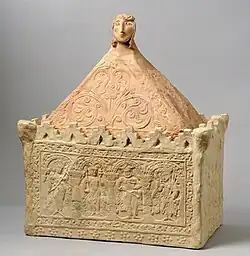 With the decoration of ossuaries, the Sogdians expressed their wishes for the afterlife. As per Mazdaism practice, the body of the deceased would be excarnated and the bones then placed in a container, the ossuary, which was then put into a naos. Ossuaries were generally made of terracotta. The lid can be flat, pyramidal, or domed. They were often covered with slip, used like paint. Almost all decorations have to do with the soul's journey in the afterlife, and portray religious tenets and practices. The 7th/8th century ossuary from Mulla kurgan has a pyramidal lid with a couple standing beneath moon and sun and carrying a branch on each side, while a priest is depicted on each of the ossuary main body's side. The figures on the lid may be dancing, thus "alluding to the pleasures of paradise, a place of music and song."[5]