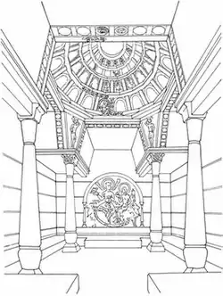 In time, there were modifications, which however did not change the basic structure of the temples, with the ritual remaining substantially the same. Additional chapels built at the temple suggest that new cults were introduced, and the practices became more complicated. In the other building other sanctuaries were built on its southern side. One likely had a continuously burning fire. A courtyard was located at the southeastern end of the platform, which was originally painted.[30] In the temple there was a pilaster-altar similar to a Sasanian altar, however, no traces of fire have been found on it, nor on the surrounding walls. Hence, it probably had another use. There was once a large tree near this altar, possibly a pistachio tree or a willow. A wall was later built against the southern facade of the temple platform, blocking the yard with the tree. The other room formed by the new wall had three wide steps leading to a niche. Below the first step, set into the floor, there was a grinding wheel. On the north wall there was a niche with tritons decorating the pedestal, depicted as supporting it. Such image could indicate a connection with water for this sanctuary. More sanctuaries were later added to the temple, especially on the southern part of the platform.[30] There is a hall, the way leading to it being rather complicated, with special openings. It contains a temple, in which today Parsis say prayers. The special openings allowed the worshipers to see the fire as they prayed.[30] In an important place, close by the atashgah, there is a room with neither niches nor sculptures, whose original purpose is unknown.[30] After a "special house" for the fire was introduced, the rituals became quite complicated.[30] With the introduction of a new sanctuary later in time, the rituals became yet more complicated.[30] At a time coinciding with the Hepthalite invasion (6th century) the walls of the city were demolished and the temple underwent changes. Some sanctuaries were blocked and a pylon was built over the sacred fire. It is possible that, after the invasion, the population returned to some earlier rituals which didn't require the eternal fire.[30] Sogdian terminology and the many images of gods suggest that the temples were considered by Sogdians "the house of the gods," similarly to the Greeks.[30] According to Marshak, there was technology in the temple that allowed to raise the image of a god. There was also a room that was possibly assigned to theatrical effects. It is possible that the rituals had a theatrical nature, including special effects, with the Sogdians possibly performing religious/mythological scenes.[30] Two murals (found in a chapel and in the courtyard), dating to the 6th century, confirm the practice of theatrical worship.[30] All works at the temple were funded by private donors.[30] In the temple there was also a bakery.[30]