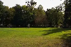 The garden square is dominated with linden trees, with other species present there beings spruces yews, horse chestnuts, black locust, and European beech.[18] There are also placed a historic water well, and a monument, in form of a commemorative rock, celebrating the 50th anniversary of the nearby Lindley Filters, as well as the park's namesake, Alfons Grotowski, a 19th-century engineer and co-creator of the city's waterworks and sewage system.[19] Additionally, at the corner of Lindley and Nowy Gród Streets stands a sandstone obelisk, dating to 1799, which was moved there from the cemetery next to the former building of the Child Jesus Hospital, now Warsaw Insurgents Square, dedicated to over 30,000 people whom were burried there.[7] At the intersection of Lindley and Koszyki Streets is also placed a monument, in a form of a commemorative rock with an inscription, dedicated to 107 workers from Yugoslavia whom worked on the reconstruction of Warsaw after the Second World War, and whom in 1946, had their departing party hosted at the square.[14][15]