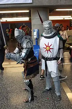 Solaire is described as a skilled warrior who does not rely on any special powers to win beyond his signature miracles and rigorous training, as his equipment exhibits no special traits. His armor and shield are decorated with a hand-painted sun, reflecting his worship of the Sun, and by association, Lord Gwyn. While he was theorized by some fans to be Gwyn's firstborn son in disguise, this was later proven not to be the case in Dark Souls III.[3] He uses a longsword called the Sunlight Straight Sword, which is described as a "featureless long sword contain[ing] the very power of the sun", as well as being "well-forged, and [kept] in good repair [...] but unlikely to live up to its grandiose name".[4][5] The sword reappears in Dark Souls II as the Sun Sword, and in Dark Souls III under its original name, where it does have the special power to boost the attack of allies. His armor and shield are also obtainable in Dark Souls III by trading various items.