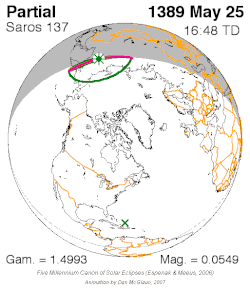 | 137 | 1 | May 25, 1389 | 16:48:11 | Partial | 64.4N 139.8E | 1.4993 | 0.0549 | [1] | ||