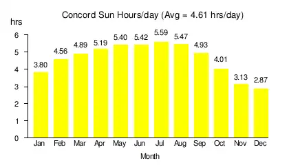 Solar power in New Hampshire provides a small percentage of the state's electricity. State renewable requirements and declining prices have led to some installations. Photovoltaics on rooftops can provide 53.4% of all electricity used in New Hampshire, from 5,300 MW of solar panels, and 72% of the electricity used in Concord, New Hampshire.[2] A 2016 estimate suggests that a typical 5 kW system costing $25,000 before credits and utility savings will pay for itself in 9 years, and generate a profit of $34,196 over the rest of its 25-year life. A loan or lease provides a net savings each year, including the first year.[3] New Hampshire has a rebate program which pays $0.75/W for residential systems up to 5 kW, for up to 50% of the system cost, up to $3,750.[4] However, New Hampshire's solar installation lagged behind nearby states such as Vermont and New York, which in 2013 had 10 times and 25 times more solar, respectively.