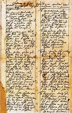 The melody was a favourite of Bellman's, and is of French origin, where it had been used by Antoine de Bourbon.[15] It is found in Joseph de La Font's 1714 opéra-ballet Fêtes de Thalie, the music composed by Jean-Joseph Mouret under the name of "Le Cotillon". This may not have been where Bellman obtained the melody, as it was, the musicologist James Massengale writes, evidently a popular tune at that time, known by many different names ("timbres"). Bellman knew it as "Si le roy m'avoit donné", and set his song "Uppå vattnets lugna våg" in the 1783 edition of Bacchi Tempel, and his poem "Ur en tunn och ljusblå sky", to the same tune.[16]
