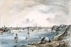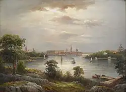 Skinnarviken, then a small bay on Stockholm's Södermalm island, below its highest point, Skinnarviksberget, facing Lake Mälaren | ![]() |