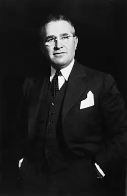 Low was elected to the Legislative Assembly of Alberta in the 1935 Alberta general election that swept the Social Credit Party of Alberta to power. Low became provincial treasurer under Premier William Aberhart in 1937. Low brokered an agreement during the 1937 Social Credit backbenchers' revolt to continue the government through a three-month budget and to try to bring Major C. H. Douglas to Alberta.[5] As a Minister, Low introduced Accurate News and Information Act on October 1, 1937,[6] and was passed by the legislature on October 4, 1937, during a marathon session which lasted until 12:30 the next morning.[7] Lieutenant-Governor of Alberta John C. Bowen reserved royal assent until the Supreme Court of Canada evaluated the act's legality. In 1938's Reference re Alberta Statutes, the court found that it was unconstitutional, and it never became law. Low was defeated in 1940 but regained a seat in a by-election in which George Woytkiw resigned for him. Low also held the Minister of Education position in Premier Ernest Manning's government in 1943-1944.[4]
