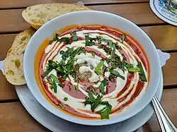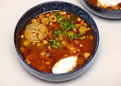 Solyanka (Russian: соля́нка, initially селя́нка; [sɐˈlʲankə]) is a thick and sour soup of Ukrainian[4][5] origin. It is a common dish in Russia, Ukraine, Belarus, the Baltic states,[6] and other post-Soviet states and other parts of the former Eastern Bloc. It was one of the most reliably available dishes in the former East Germany (German: Soljanka).[3]