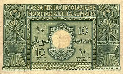 The Cassa per la Circolazione Monetaria della Somalia, headquartered in Rome, began operations 18 April 1950 and was authorized to issue 55 million shillings in paper money. It released notes in denominations of 1, 5, 10, 20 and 100 Somali on 22 May 1950. The banknotes were written in Italian and Arabic languages.