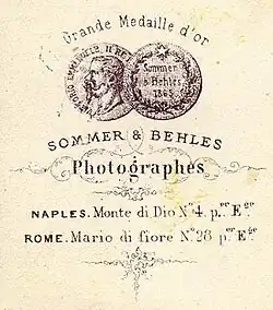 Sommer and Behles was a 19th-century Italian photography studio created by the partnership of photographers Giorgio Sommer (1834-1914) and Edmund Behles (1841-1921).[1][2] Studios were located in Rome at No. 28 Mario di Fiori, and in Naples at No. 4 Monte di Dio. Each photographer had independent careers and studios prior to and following the partnership, which began in 1867 and was dissolved in 1874.[3]
