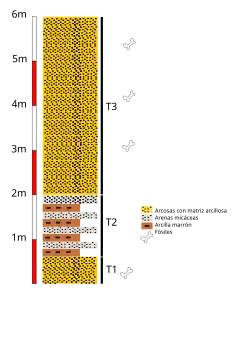 - Section 3 (T3): At the top of the series, it has a thickness of more than 3 m (9.8 ft), formed by arkoses with clayey matrix. The macrovertebrate fossils of Somosaguas Norte are found in this section.