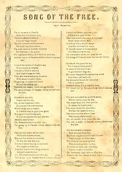 "Song of the Free" is a song of the Underground Railroad written circa 1860 about a man fleeing slavery in Tennessee by escaping to Canada via the Underground Railroad.[1] It has eight verses[1] and is composed to the tune of "Oh! Susanna".