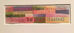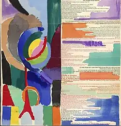 The Delaunays' friend, the poet and art critic Guillaume Apollinaire, coined the term Orphism to describe the Delaunays' version of Cubism in 1913. It was through Apollinaire that in 1912 Sonia met the poet Blaise Cendrars who was to become her friend and collaborator. Sonia Delaunay described in an interview that the discovery of Cendrars' work “gave me [her] a push, a shock.”[7] She illustrated Cendrars' poem La prose du Transsibérien et de la Petite Jehanne de France (Prose of the Trans-Siberian and of Little Jehanne of France) about a journey on the Trans-Siberian Railway, by creating a 2m-long accordion-pleated book. Using simultaneous design principles the book merged text and design. The book, which was sold almost entirely by subscription, created a stir amongst Paris critics. The simultaneous book was later shown at the Autumn Salon in Berlin in 1913, along with paintings and other applied artworks such as dresses, and it is said that Paul Klee was so impressed with her use of squares in her binding of Cendrars' poem that they became an enduring feature in his own work.