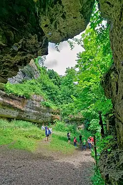 During renewed excavations in 1905 and 1906, a large number of remains of cave bears, cave lions, and hyenas were again found.[12] The total length of the cave, including the outer cave, was redetermined in 1966 by the Nuremberg Natural History Society to be 465 meters.[12] In 1971, the carbide lamps previously used in guided tours were replaced by electric lighting.[17] In the 1970s, the Hösch Cave, which had been closed and cut off during development work in 1833, was rediscovered. In 1997, the entire cave had to be remeasured again, as further discoveries were made in the course of more recent research work by speleologists from Bayreuth and Nuremberg. The new survey, together with the Hösch Cave, resulted in a length of about 900 meters.[2] In late summer of 2000, the show cave operation, with 34,000 visitors a year at last count, was discontinued due to safety deficiencies.
